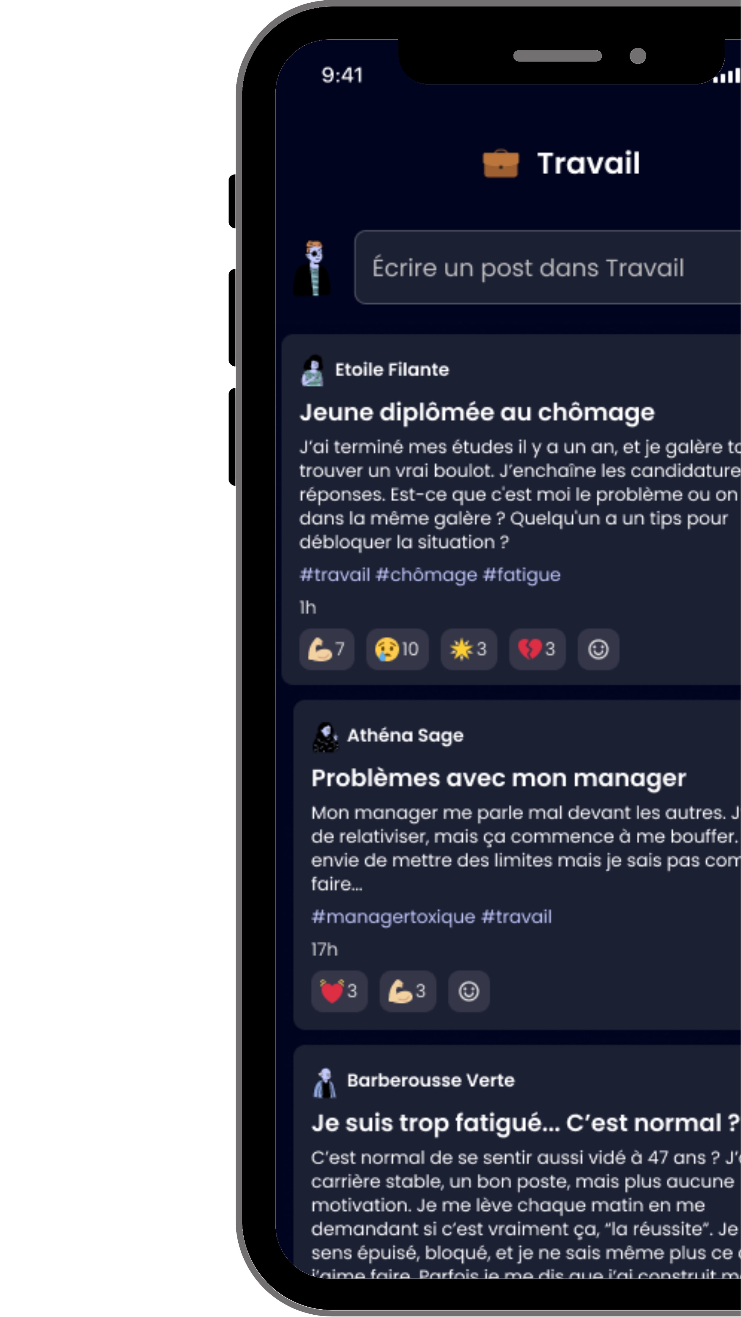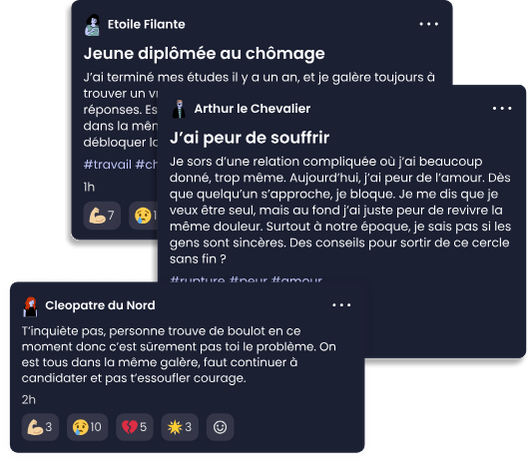 Ici, tout se partage sans jugement, anonymement, avec une communauté bienveillante où tu trouveras toujours quelqu’un qui comprend vraiment ce que tu vis.